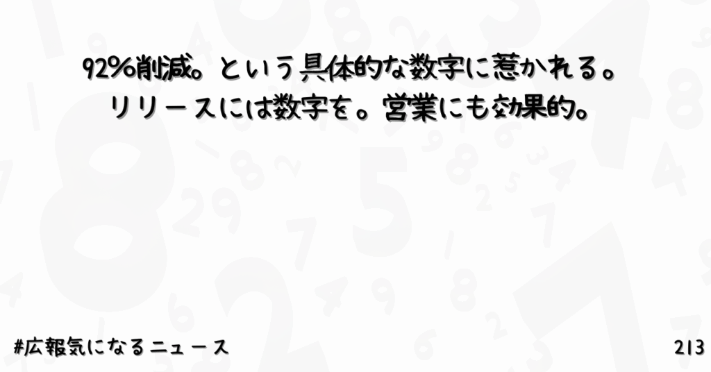 92%削減。という具体的な数字に惹かれる。リリースには数字を。営業にも効果的。213