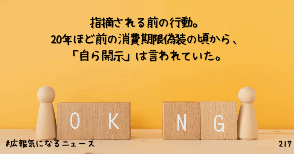 指摘される前の行動。20年ほど前の消費期限偽装の頃から、「自ら開示」は言われていた。217