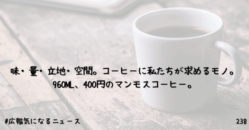 味・量・立地・空間。コーヒーに私たちが求めるモノ。960ML、400円のマンモスコーヒー。238