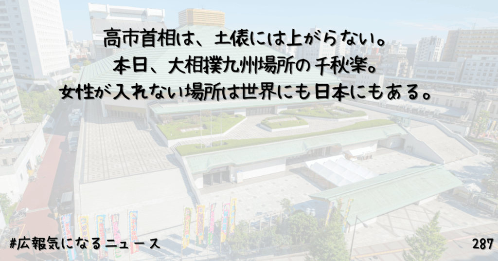 高市首相は、土俵には上がらない。本日、大相撲九州場所の千秋楽。女性が入れない場所は世界にも日本にもある。287