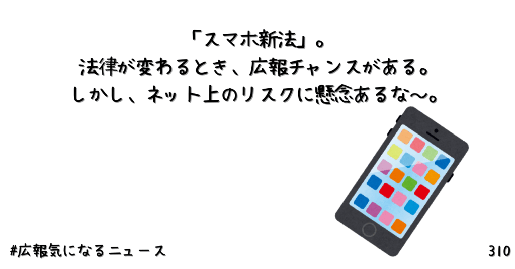 「スマホ新法」。法律が変わるとき、広報チャンスがある。しかし、ネット上のリスクに懸念あるな~。310