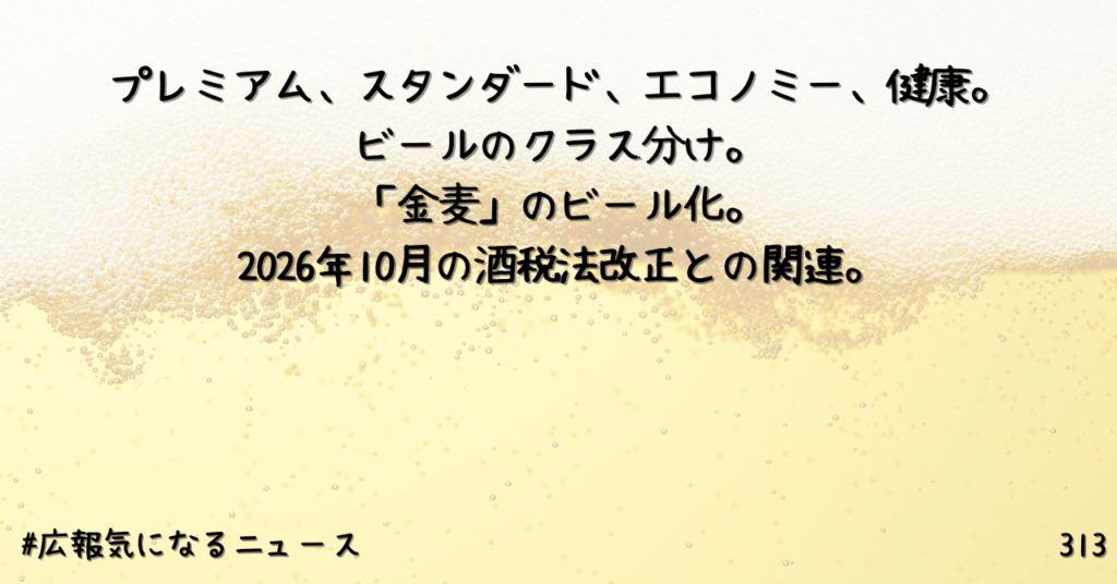プレミアム、スタンダード、エコノミー、健康。ビールのクラス分け。「金麦」のビール化。2026年10月の酒税法改正との関連。313